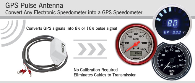 Convert your electronic automotive speedometer into a GPS speedometer with this GPS Pulse Antenna. The antenna receives GPS satellite signals and outputs the information to 8,000 or 16,000 pulse signal to your existing speedometer. This antenna eliminates connections to the transmission or the need to calibrate to your vehicles tire size.
